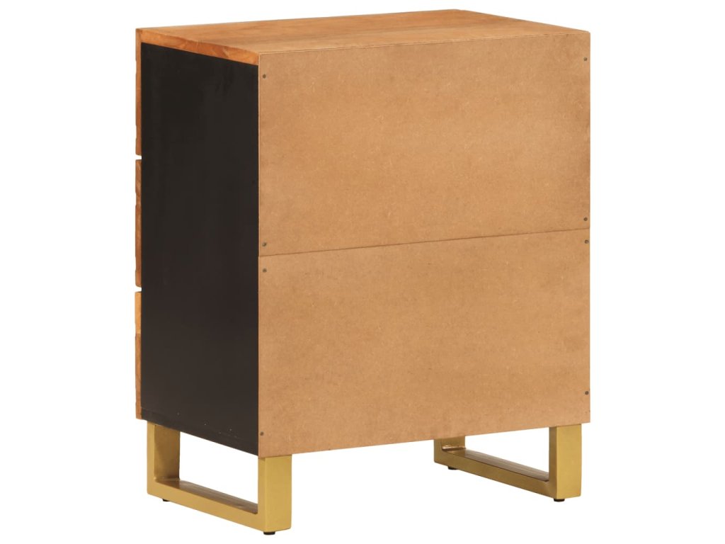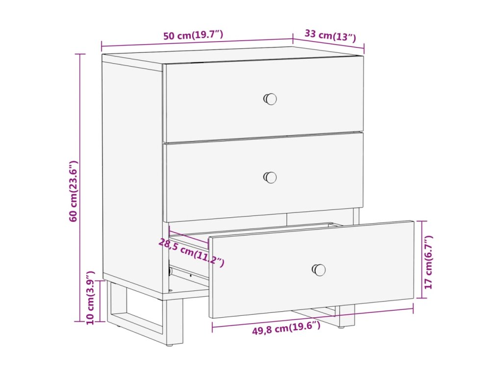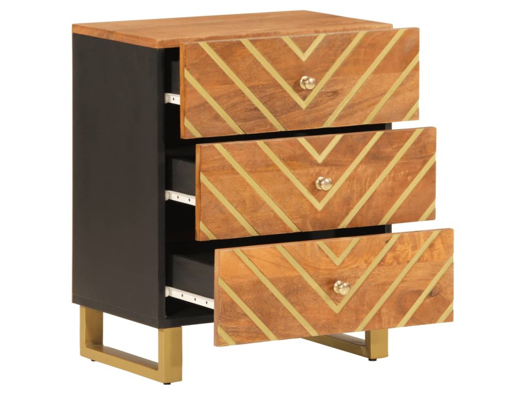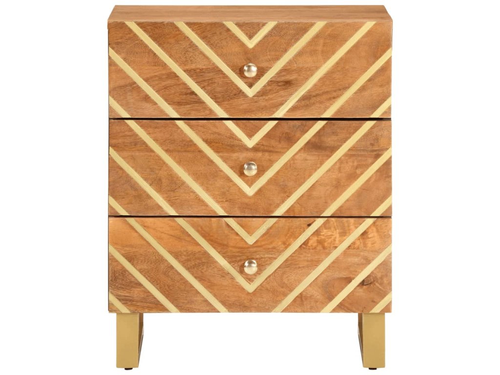 Tento nočný stolík s elegantným dizajnom vytvorí vo vašom interiéri nadčasový doplnok. Masívne mangové drevo: Masívne mangové drevo je pevné tropické tvrdé drevo, z ktorého sa vyrába robustný nábytok. Vďaka krásnej textúre dreva je každý kus nábytku výnimočný a trochu odlišný od ostatných. Je vyrobená z masívneho mangovníkového dreva a je mimoriadne stabilná a odolná.Dostatok úložného priestoru: Nočný stolík je navrhnutý s 3 zásuvkami, aby ste mali svoje veci usporiadané a na dosah ruky.Stabilná doska: Doska bočného stolíka je ideálna na vystavenie vašich obľúbených dekoratívnych predmetov, rámov obrazov a rastlín v kvetináčoch.Pevné nohy: Železné nohy tohto spálňového nábytku zaisťujú robustnosť a stabilitu. Varovanie:Aby ste zabránili prevráteniu, tento výrobok musí byť použitý s pribaleným zariadením na upevnenie na stenu